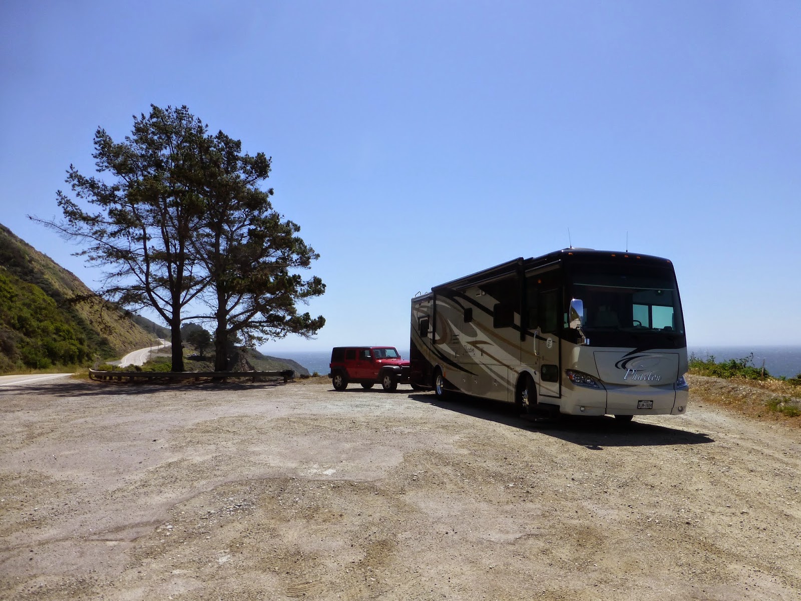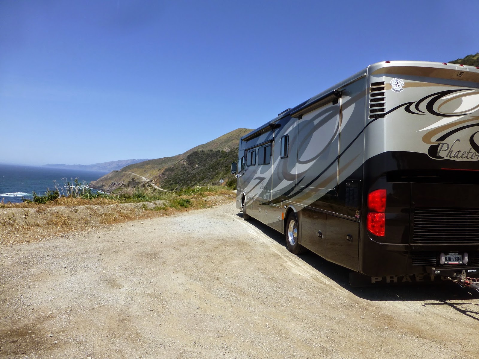 Our first stop was the Elks Lodge in San Luis Obispo (SLO). I took the wrong exit and then took the wrong turn. After a turn around the block we found our way into the Lodge parking lot with 16 RV spots that back up against the 101 so we can enjoy the road noise right through the night. It isn’t quite as bad as it sounds, but it also isn’t the desert. We made a timely, for us, departure from SLO Elks at about 10 AM and promptly got on the 1 right out of town. I suppose I could recite the towns and the views we passed, but far better authors than I have written about them in novels and stretches have been seen in documentaries and movies. The road rises and falls seeking a foothold on the edge of the mountains that line the coast. sometimes you are almost at sea level and at other times the sea is far below as the road winds around yet another gorge that forms a cleft in the mountains. In places the road has been swept off the cliff by falling rocks and has been rebuilt either by clawing another foothold into the mountain or by building a bridge to carry the road along the face of the cliff. In places the road is so narrow that we felt we were going to demolish our passenger side on the rocks yet again and at times there were broad pull offs so we could let other drivers pass us.
