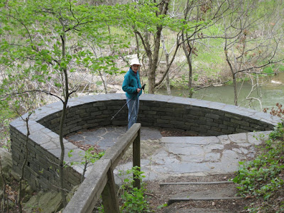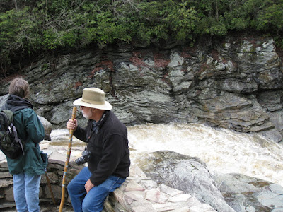 As we pulled out of Tapps RV in Asheville we knew we were facing a major detour around a large landslide about 15 miles north of us. We skipped the 50 miles, having explored the southern portion up to the slide area by car the day before. We began the journey using a wonderful book “Walking the Blue Ridge” by Leonard M. Adkins. We have had this book for a dozen years or more, but little changes on the Parkway. We had two problems. The book is laid out North to South so we felt like we reading Hebrew as we started with the book opening from the right (the back to English readers) and worked our way forward. This resulted in a number of surprises as we failed to leap ahead to the beginning of a section to read the background that we were traversing in reverse order. The other “problem” was the date. Very little (next to nothing) is open on the Parkway before May 1. This included campgrounds. I called the ranger desk and was told that Linville Falls and Peaks of Otter were the only two that were open. There is over 200 miles of ridgeline between them. Well 50% is better than nothing. We spent two lovely nights in Linville Falls CG with a couple of other RV’s and two Hosts. Even the water was not on, no problem for us as we bring our own, but for the hosts it was a very real issue. They are promised full hookups. We took a lovely hike to Linville Falls from the campground where we met and hiked with Dennis and Beth Bedell, the other motorhomers camped near us. They joined us for happy hour later that day after we went exploring in the car.